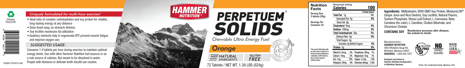 A solid source of calories designed to augment your use of Hammer Nutrition fuels, helping you reach your ideal hourly intake during exercise/competition lasting more than two hours. On occasion, Perpetuem Solids may be used as a sole source of calories if desired.
